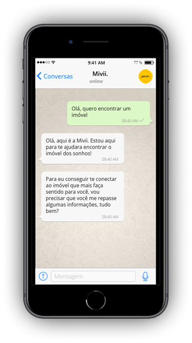 Sou uma nova geração de agente imobiliário. Em poucos minutos, eu entendo exatamente o que você procura. Quando tudo estiver alinhado, conecto você com um especialista, que vai cuidar de cada detalhe da sua decisão.